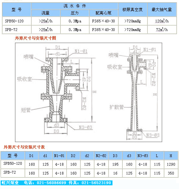 SPB型玻璃鋼水噴射真空泵SPB型玻璃鋼水噴射真空泵是一種具有抽真空、冷凝、排水等三種有效能的機械裝置。它是利用一定壓力的水流通過對稱均布成一定傾斜的噴出。聚合在一個焦點上,由于噴射水流速度很高,于是周圍形成負壓使器室內產生真空,另外由于二次蒸氣冷凝成水,少量未被冷凝的蒸氣由與不凝結的氣體亦由于與高速噴射的水互相摩擦,混合與擠壓,通過擴壓管被排除,使器室內形成更高的真空。但目前生產水利噴射器的制造廠較小,品種亦不齊全,為此,我們近年來不斷改進設計,采用多噴咀與氣環(導向盤)等結構,以及用多級泵進水,低位安裝,吸需安裝高度4.5米,完善與提高了其工作性能,具有一定的先進性,是真空冷凝設備的一種革新。